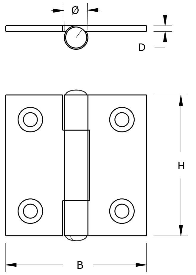 Dankzij de rechte hoeken kan het scharnier zowel opliggend worden gemonteerd als ingelaten met hamer en beitel. De verzonken schroefgaten zorgen voor een strakke afwerking, terwijl de vaste messing pen bijdraagt aan een stabiele en duurzame werking.
