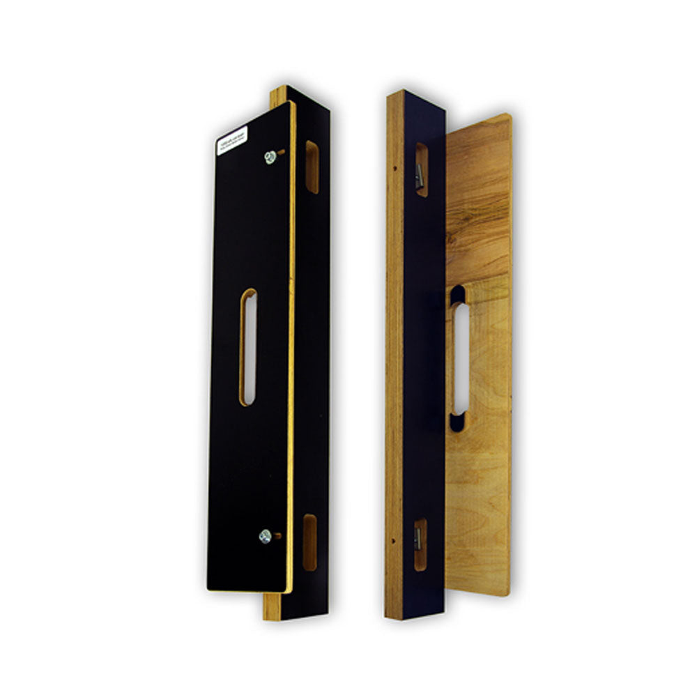 De L-vorminge freesmal heeft een verstelbare zijkant. Hierdoor is deze op iedere gewenste deurdikte te gebruiken. De twee nokken aan de onderkant van de mal vormen het contour van de voorplaat van het slot. Deze plaats je in de frezing van de voorplaat. Daardoor past deze mal maar op 1 manier op de deur en frees je de slotkast altijd goed op de goede positie ten opzichte van de voorplaat.